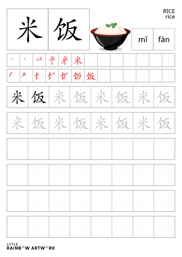 Pronunciation Practice: Encourage kids to say “mǐ fàn” aloud while tracing to reinforce memory retention.