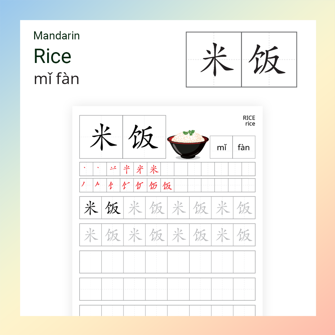 Chinese Character Recognition: Helps children identify and understand the Mandarin word for “Rice”.